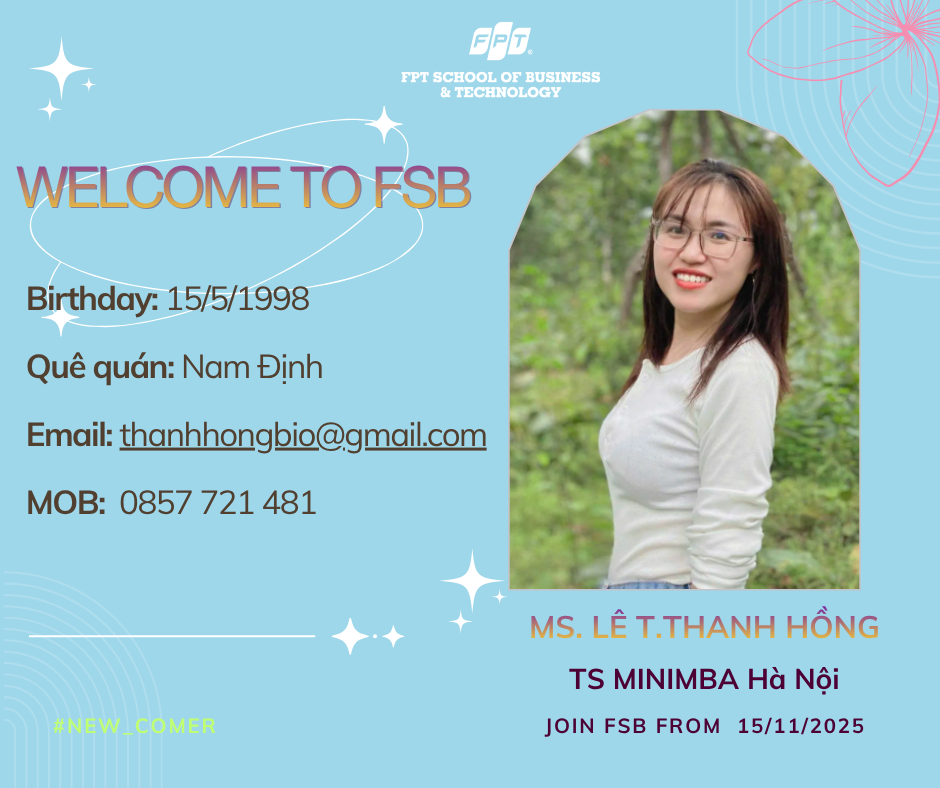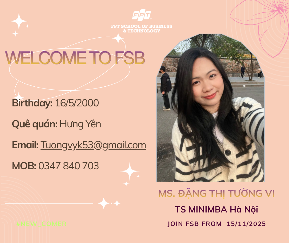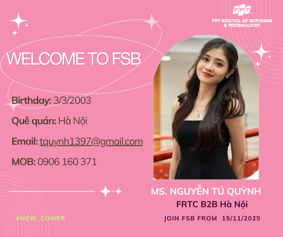 Ngày 15/11/2025 đánh dấu một cột mốc đặc biệt khi FSB vui mừng chào đón 3 thành viên mới chính thức gia nhập đội ngũ. Mỗi bạn đều mang theo những năng lượng riêng, góp phần tạo nên một tập thể ngày càng vững mạnh và sáng tạo hơn.