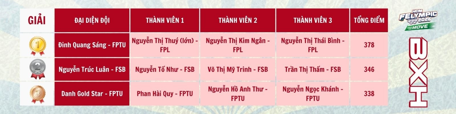 Đặc biệt, Đội 1 – đội hạt giống đã ghi dấu ấn mạnh mẽ với 346 điểm, xuất sắc xếp thứ Nhì toàn đoàn, qua đó mang về Huy chương Bạc – thành tích đầu tiên của FSB tại mùa giải năm nay.