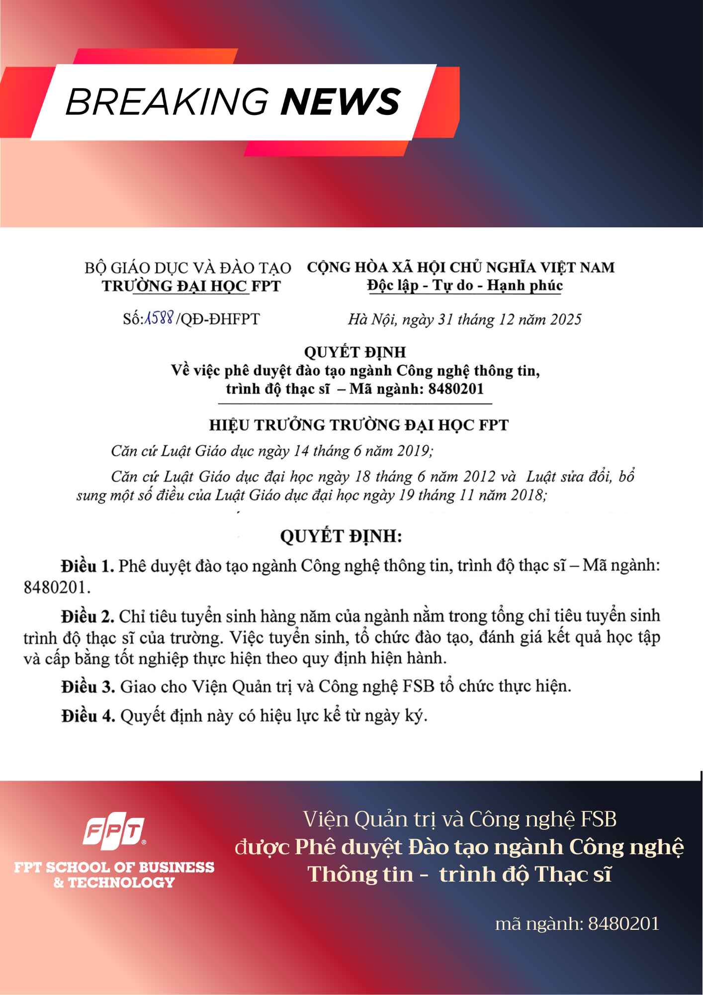 Viện Quản trị & Công nghệ FSB trân trọng thông báo: Ngành Công nghệ Thông tin – trình độ Thạc sĩ đã chính thức được Hiệu trưởng Trường Đại học FPT phê duyệt đào tạo kể từ ngày 31/12/2025.