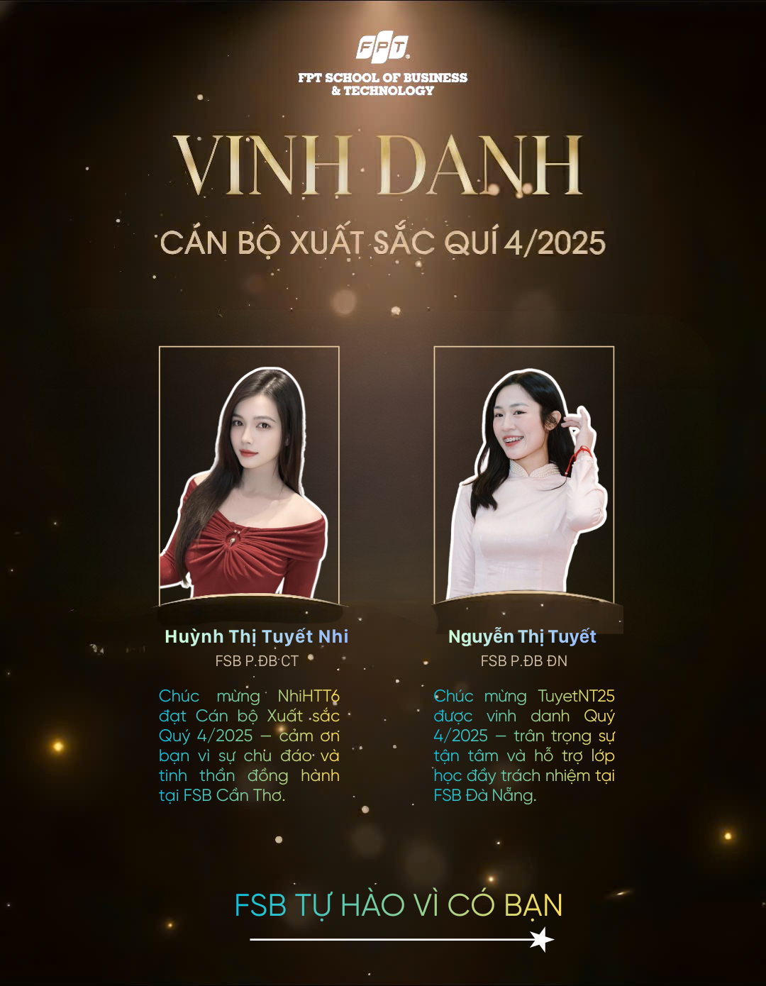Một lần nữa, xin chúc mừng các anh/chị/em! Chúc toàn thể CBNV FSB tiếp tục giữ vững tinh thần tích cực, sẵn sàng bứt phá và cùng nhau chinh phục những mục tiêu mới trong chặng đường phía trước .