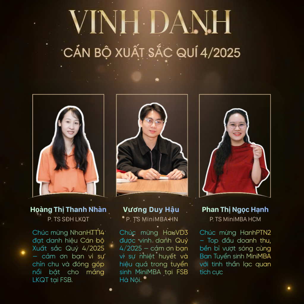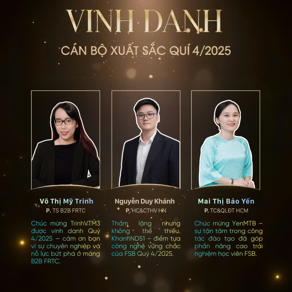 Quý 4.2025 khép lại với nhiều dấu ấn tích cực, ghi nhận sự nỗ lực bền bỉ, tinh thần trách nhiệm và khát vọng tạo giá trị của đội ngũ cán bộ FSB trên toàn hệ thống. Những thành tích hôm nay không chỉ là kết quả của sự cố gắng cá nhân, mà còn là minh chứng cho tinh thần đồng hành, chủ động và không ngừng vượt lên chính mình.
