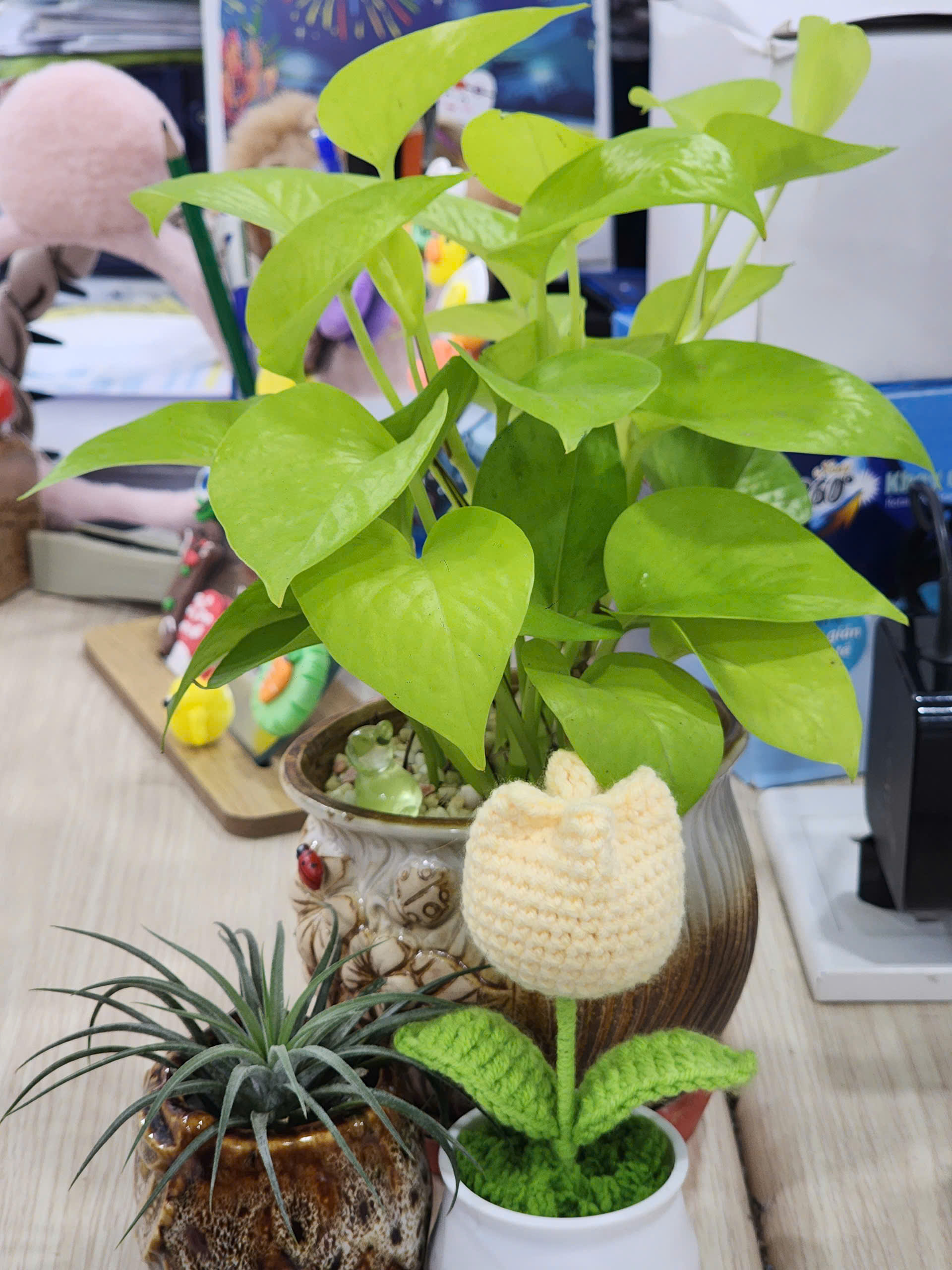 từ những chậu cây nhỏ xinh, dễ chăm, đến các loại cây lá xanh mát mắt hay những chậu cây ngộ nghĩnh, đáng yêu mang dấu ấn cá nhân. Có bàn chọn cây để “lấy vía may mắn”, có bàn trồng cây đơn giản chỉ để mỗi ngày nhìn vào thấy nhẹ nhàng hơn.