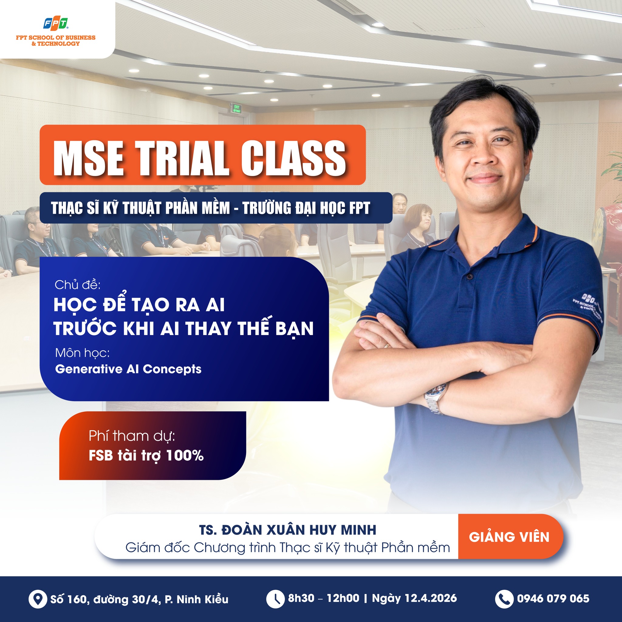 12/04 – Trial Class MSE “Khám phá Generative AI – Công nghệ AI đang định hình tương lai phần mềm” cùng TS Đoàn Xuân Huy Minh. Một chủ đề “đúng trend – trúng nhu cầu”, mở ra góc nhìn thực tiễn về cách AI tạo sinh đang thay đổi ngành công nghệ và vận hành doanh nghiệp.