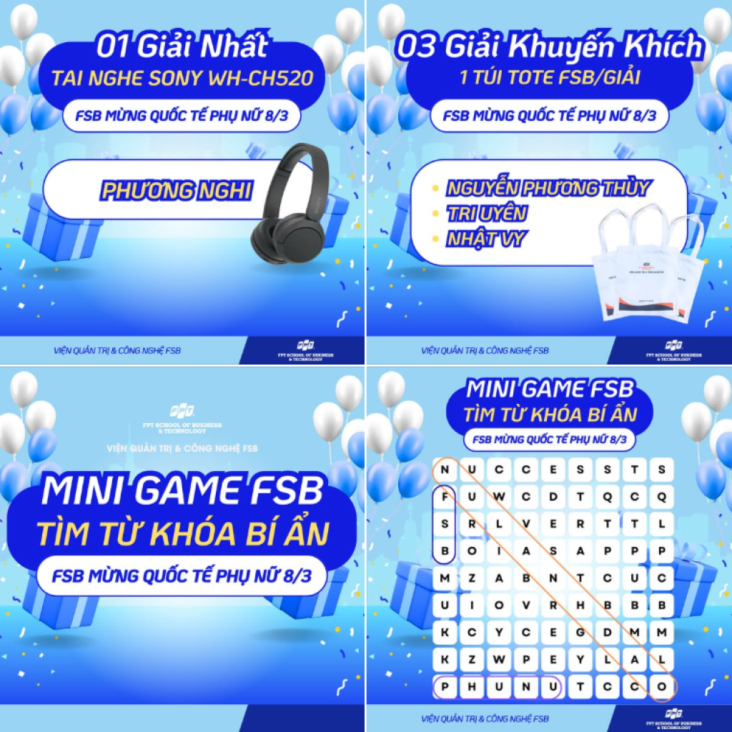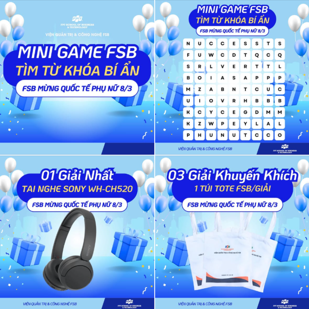 Mở đầu là không khí sôi động trên Fanpage Cao học FSB Cần Thơ với Minigame “Tìm từ khóa bí ẩn FSB 8/3: SĂN QUÀ XỊN” – một điểm chạm thú vị giúp gia tăng tương tác và lan tỏa hình ảnh chương trình đến cộng đồng học viên tiềm năng.