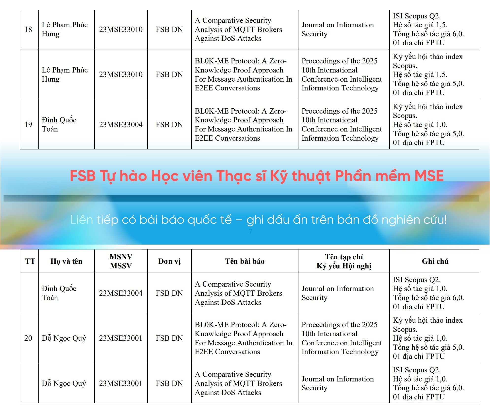 ✨FSB chúc mừng học viên Thạc sĩ Kỹ thuật Phần mềm MSE tại Đà Nẵng đã có nhiều bài báo quốc tế (ISI/Scopus, hội thảo Scopus) trong tháng 02/2026. Đây là minh chứng cho năng lực nghiên cứu và sự đồng hành hiệu quả giữa học viên – giảng viên.