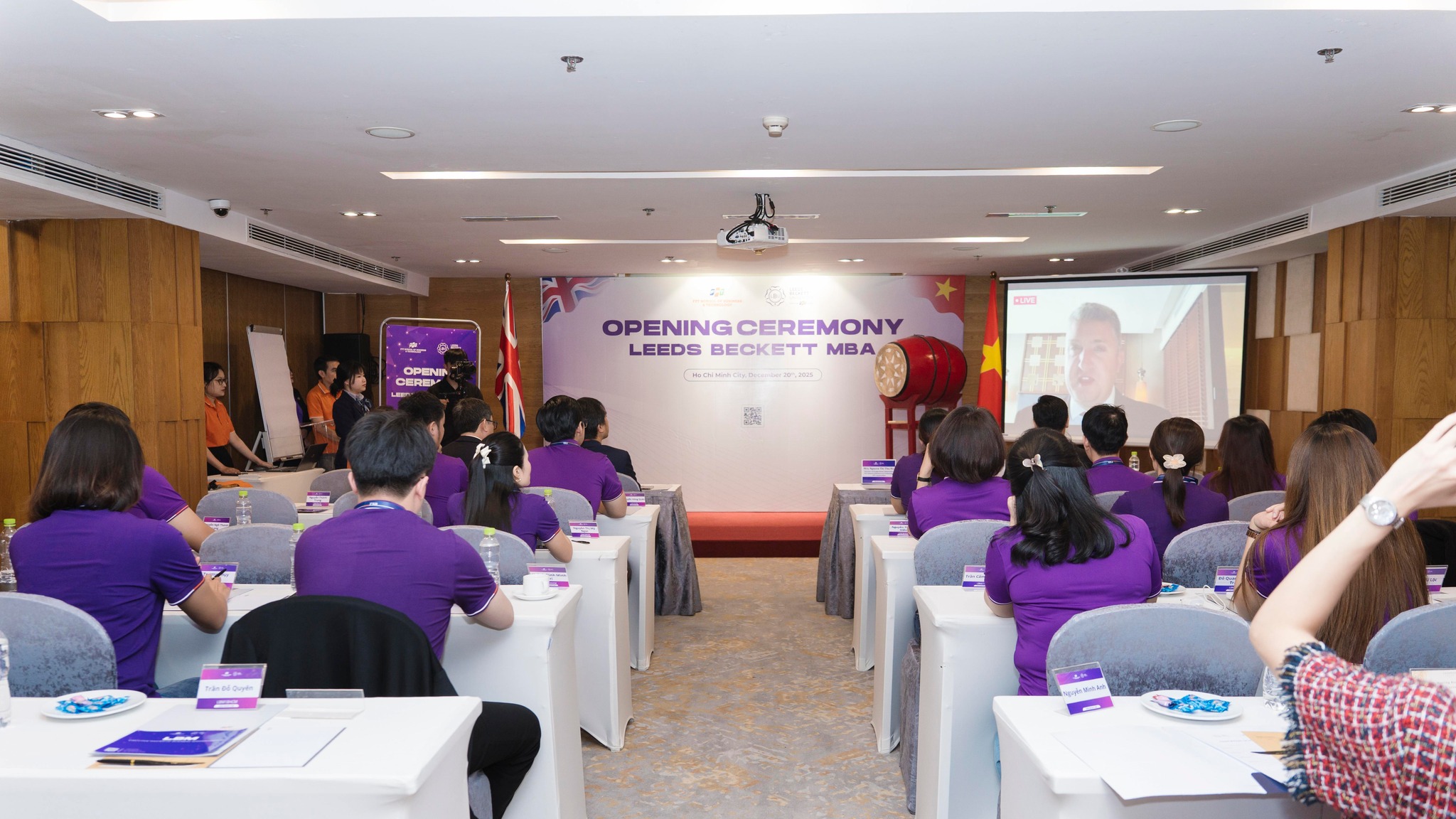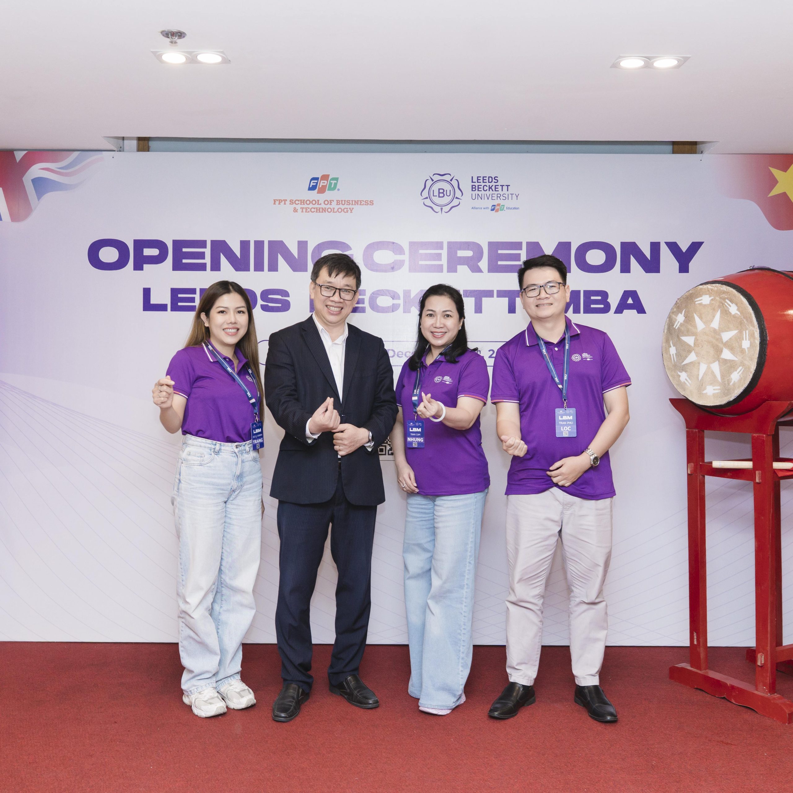 Không khí háo hức và phấn khởi – từ hồi trống trường vang lên, những lời gửi gắm đầy kỳ vọng của Đại diện Ban Lãnh đạo FSB, TS. Đoàn Xuân Huy Minh, cùng Ông Liam Howarth – Giám đốc khu vực (Đông và Đông Nam Á bao gồm Trung Quốc và Pakistan), Trường Đại học Leeds Beckett (UK) – đã hòa quyện tạo nên một khoảnh khắc mở đầu giàu cảm hứng. Đó không chỉ là dấu mốc khai giảng, mà còn là cánh cửa mở ra hành trình học tập trong môi trường giáo dục quốc tế, hiện đại và chuẩn mực toàn cầu.