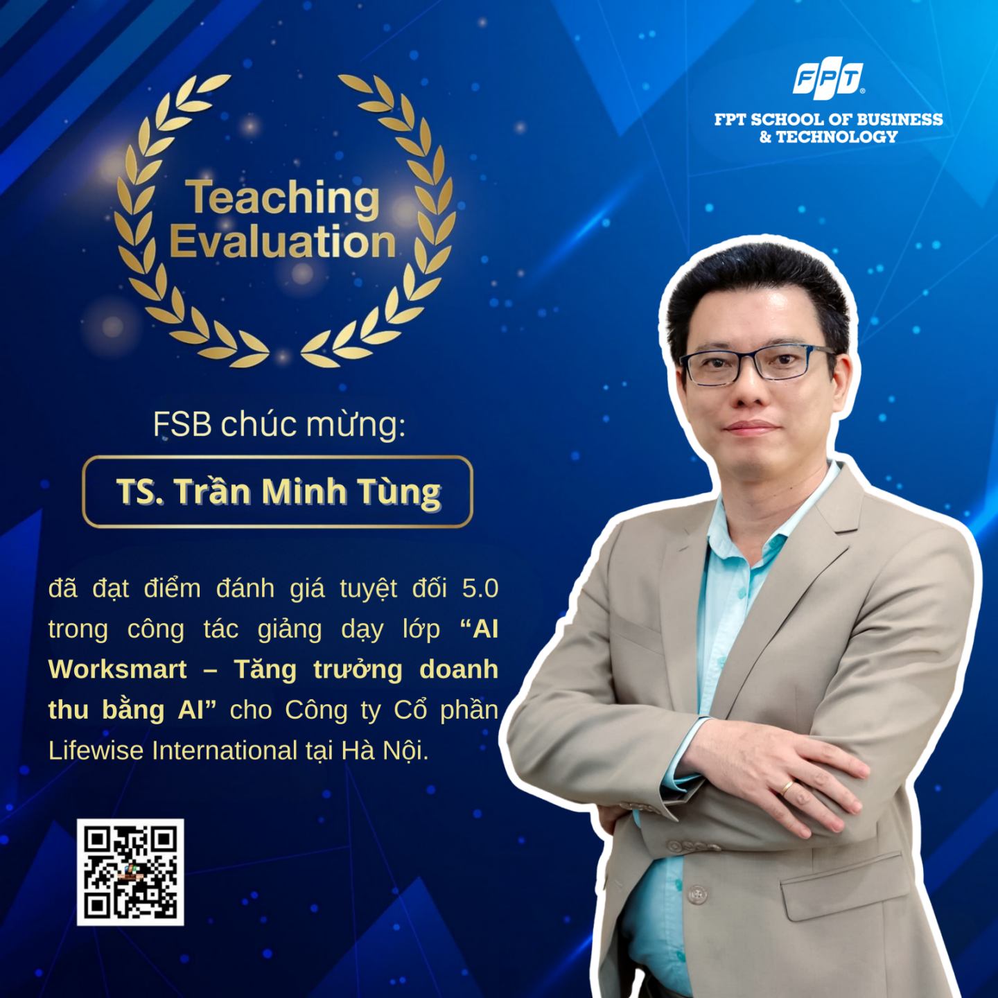 FSB Hà Nội trân trọng gửi lời chúc mừng và vinh danh giảng viên – TS. Trần Minh Tùng (FSB Đà Nẵng) đã xuất sắc đạt điểm đánh giá giảng dạy tuyệt đối (GPA 5.0) trong khóa học “AI Worksmart – Tăng trưởng doanh thu bằng AI” dành cho Công ty Cổ phần Lifewise tại Hà Nội.